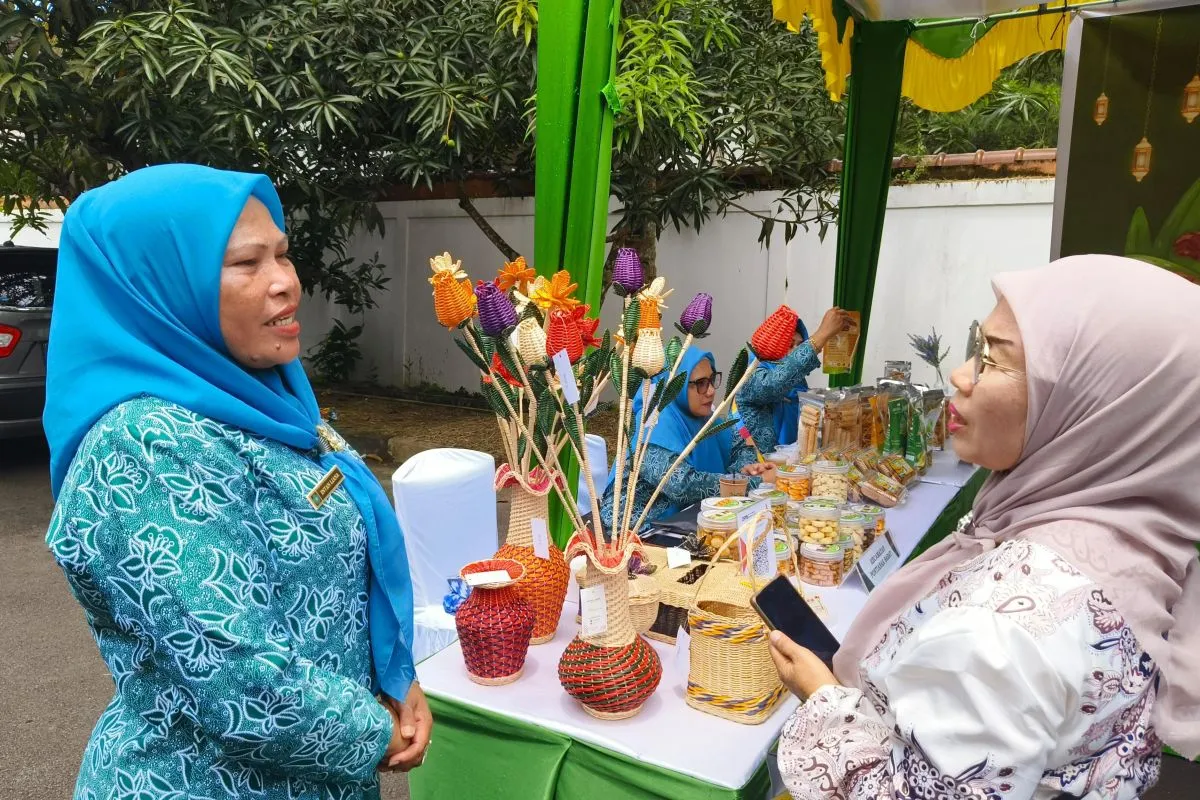 Intan Liana menunjukkan tas keladi air dan QRIS BRI saat pameran TP PKK Pontianak, Senin (21/4/2025). (ANTARA/Dedi)
