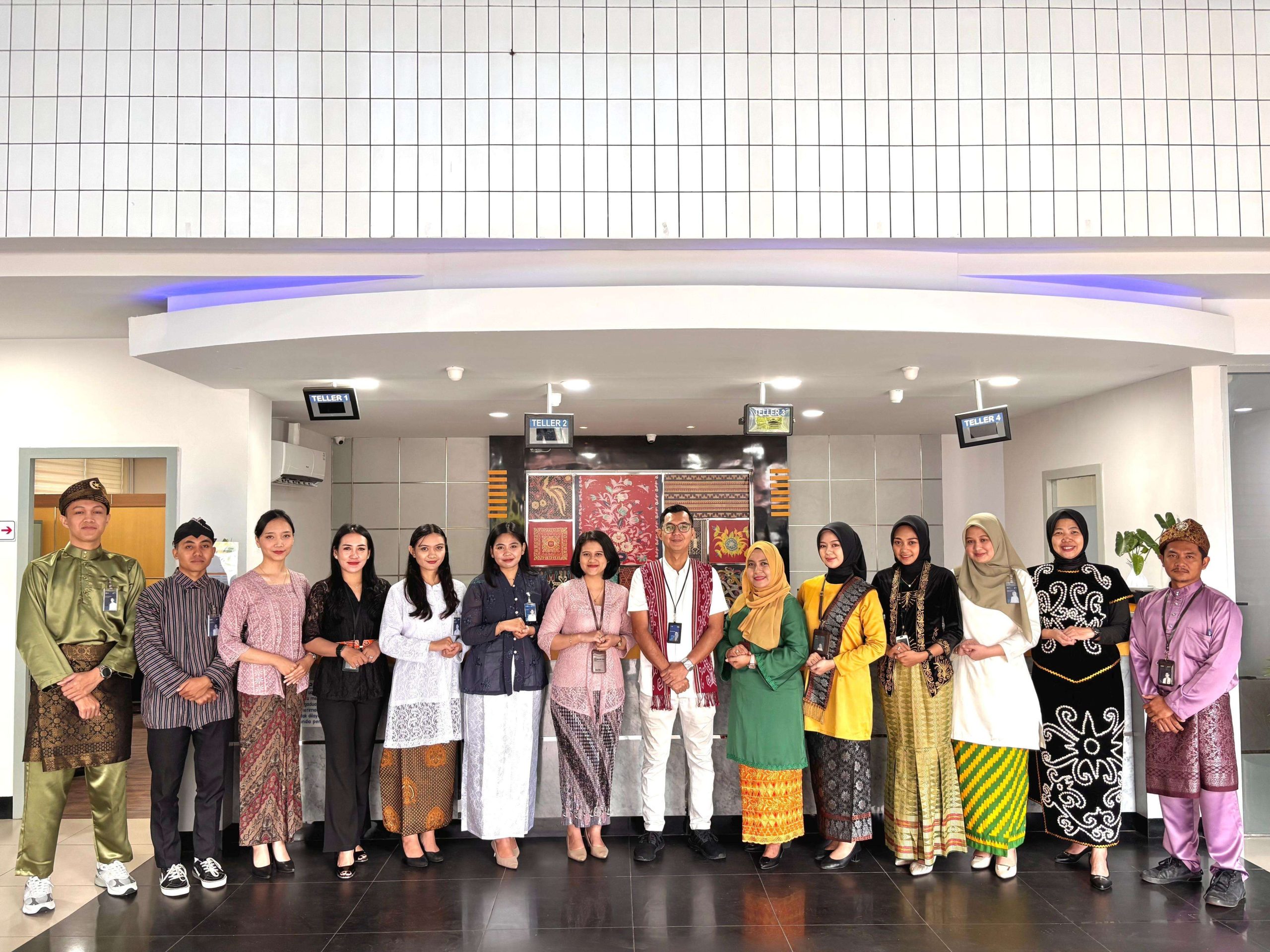 Para pekerja pegawai wanita tampil anggun mengenakan kebaya lengkap dengan aksesori khas, karyawan pria juga turut mendukung dengan memakai batik dan pakaian adat.