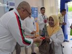 Radarnews- Pemimpin BRI Cabang Sanggau Helmi Wijayadi menyambut dan memberikan gift berupa coklat kepada lima nasabah pertama yang melaksanakan transaksi di BRI